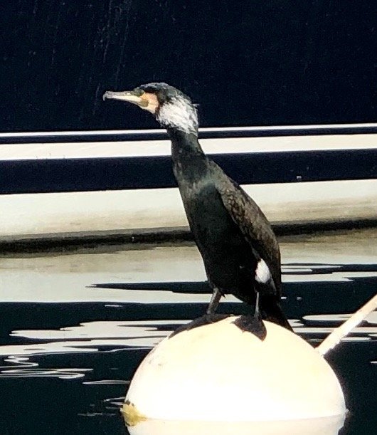 Phalacrocorax carbo arbore sur la cuisse une tâche blanche typique et sa tête blanchie. Regardez bien ils sont généralement sur les bouées dans le Port.
