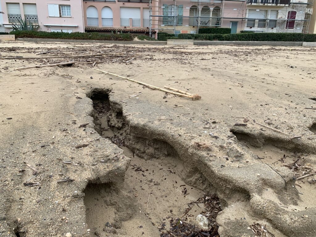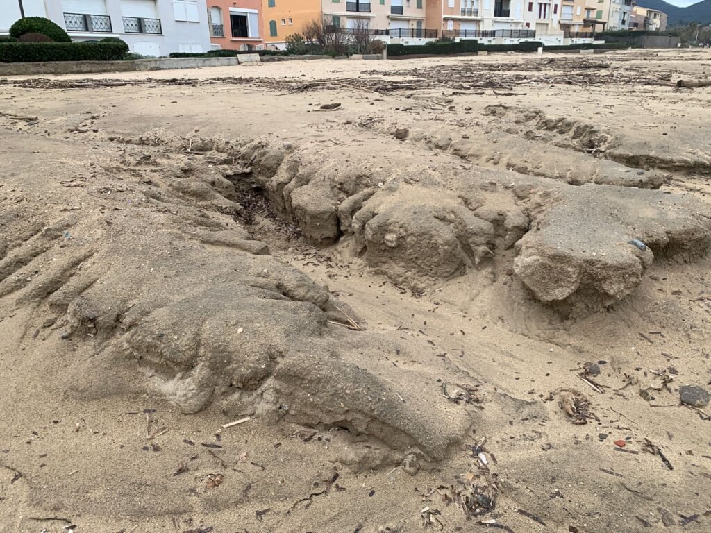Par ailleurs, les dépôts temporaires liés au dragage, le passage répété de véhicules (travaux, nettoyage…) et l’installation de structures saisonnières contribuent à tasser fortement le sable. À certains endroits, la plage se durcit presque comme du béton, ce qui favorise la montée rapide de l’eau lors des épisodes de mer agitée, avec des débordements déjà constatés en bout d’avenue de la Mer.