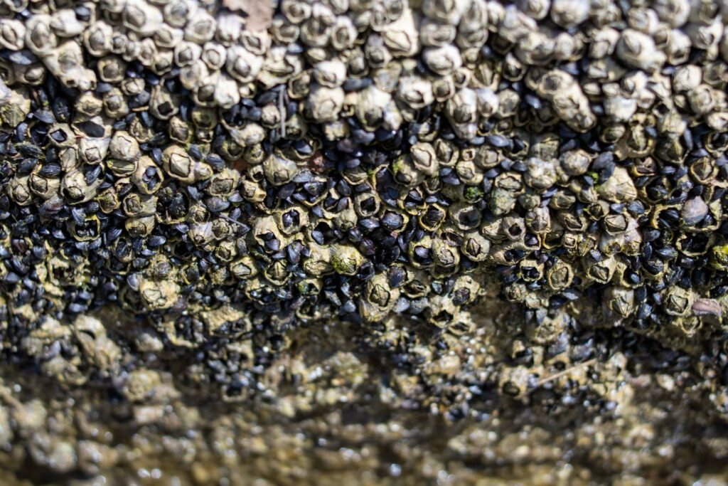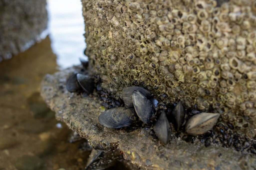 Ces moules, appartenant à l’espèce Mytilus edulis, se mélangent aux balanes (Balanus amphitrite) et certaines croissent même à l’intérieur des carapaces.