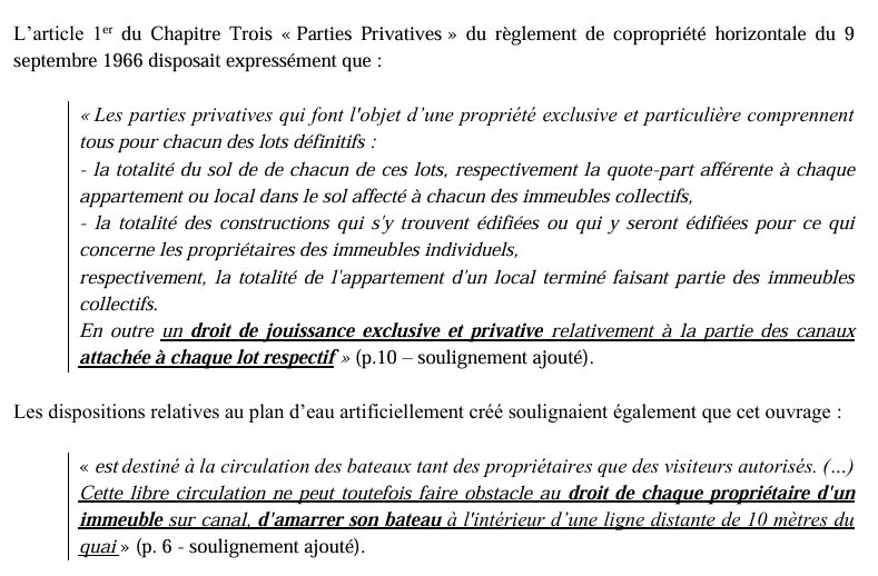 Il reprend plusieurs arguments de nos avocats, à savoir que l’entrée dans le DPM ne s’est faite qu’à la date de l’acte de cession entre l’ASL ou l’ASP et l’Etat (soit en 1982 pour Port-Grimaud 2 et 1984 pour Port-Grimaud 1) et non avant, à l’ouverture du plan d’eau vers la mer début 1968.